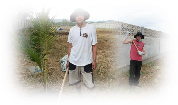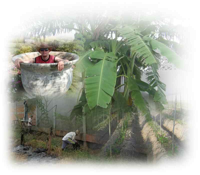 Olemme istuttaneet trooppisia kasveja ja hedelmäpuita: Lamyai, Longan, Pomelo, Lee Lavadee, Bambu, Sitruuna, Noyna, Linchee, Mango, Papaya, erilaisia kookospalmuja, . Banaanitkin kasvavat hurjaa vauhtia alkuun päästyään kuten kuvasta näkyy (06/2013).